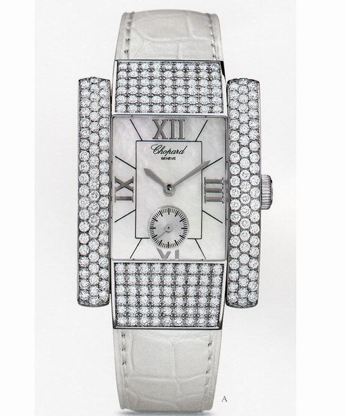 Корпус из золота 18 карат, украшен 34 алмазами общим весом около 2.99 карата, часы, минуты, позолоченные стрелки и метки, вес: 27.8 грамма, кожаный ремешок.